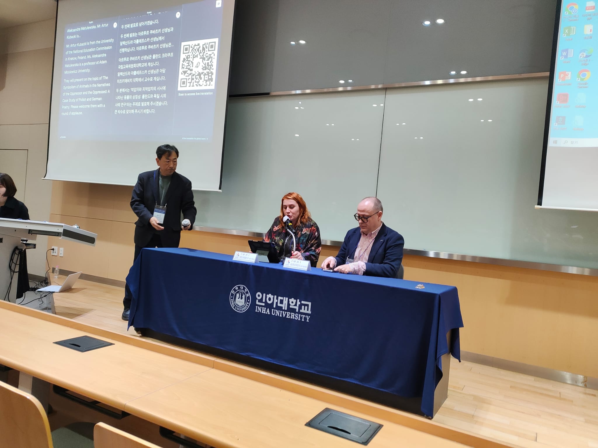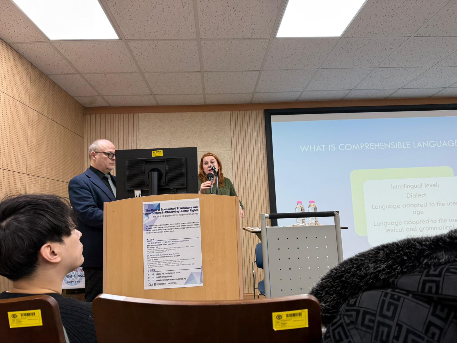 Istotnym elementem wizyty była również wymiana akademicka na Yonsei University w Seulu. Na zaproszenie uczelni dr hab. Artur Kubacki, prof. UKENoraz dr hab. Aleksandra Matulewska, prof. UAM wystąpili w charakterze profesorów wizytujących, wygłaszając wykład oraz uczestnicząc w pogłębionych dyskusjach naukowych. Szczególne miejsce w programie zajęła prezentacja badań dotyczących roli tłumaczy specjalistycznych i tłumaczy ustnych w ochronie oraz monitorowaniu praw człowieka, co znalazło również odzwierciedlenie w materiale promocyjnym wydarzenia.