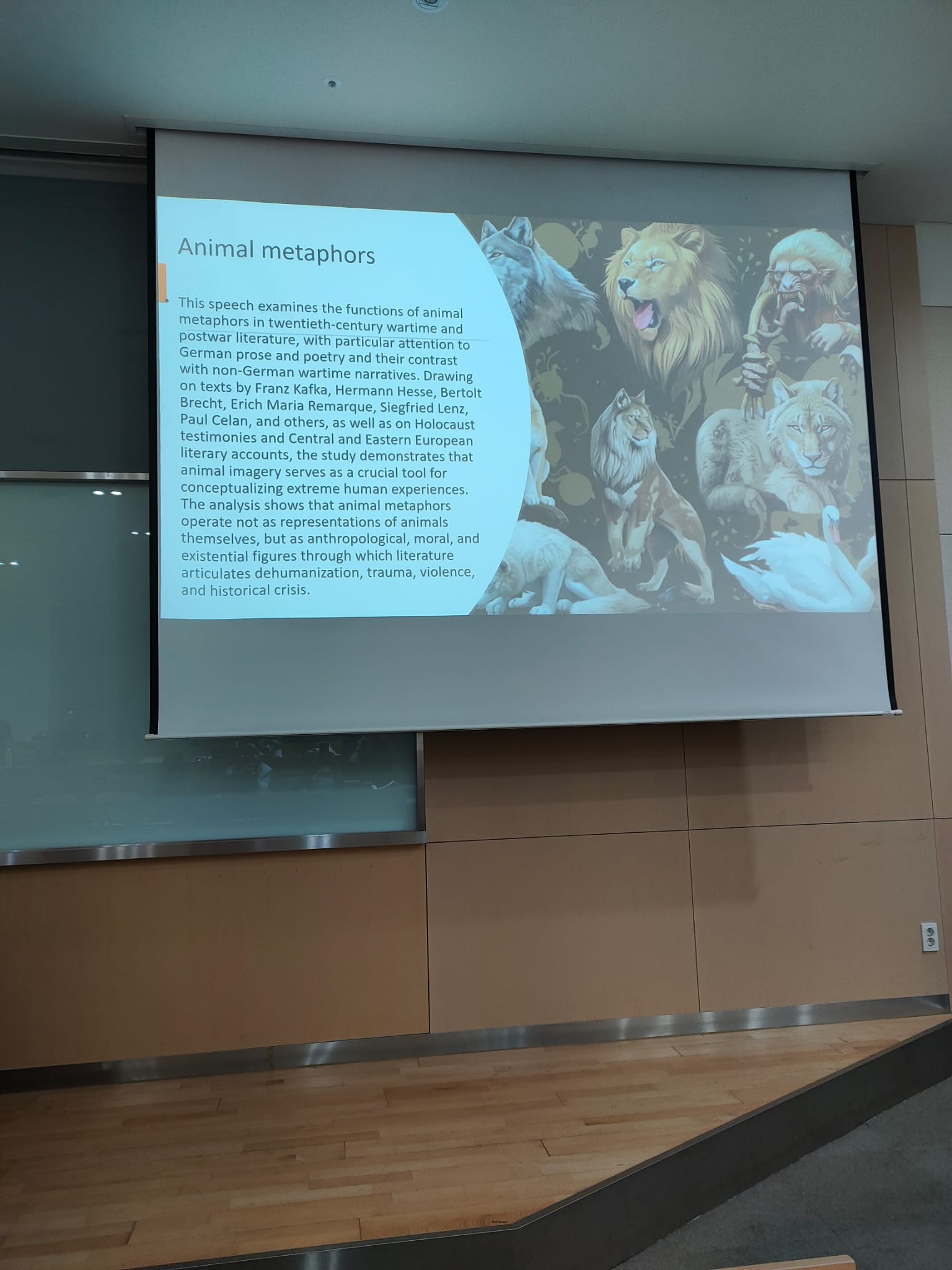 Podczas konferencji zaprezentowany został wspólny referat pt. Symbolism of Animals in Narratives of Occupied and Occupying Countries – A Case Study of Polish and German Poetry and Prose, poświęcony porównawczej analizie symboliki zwierząt w polskiej i niemieckiej literaturze okresu wojennego.